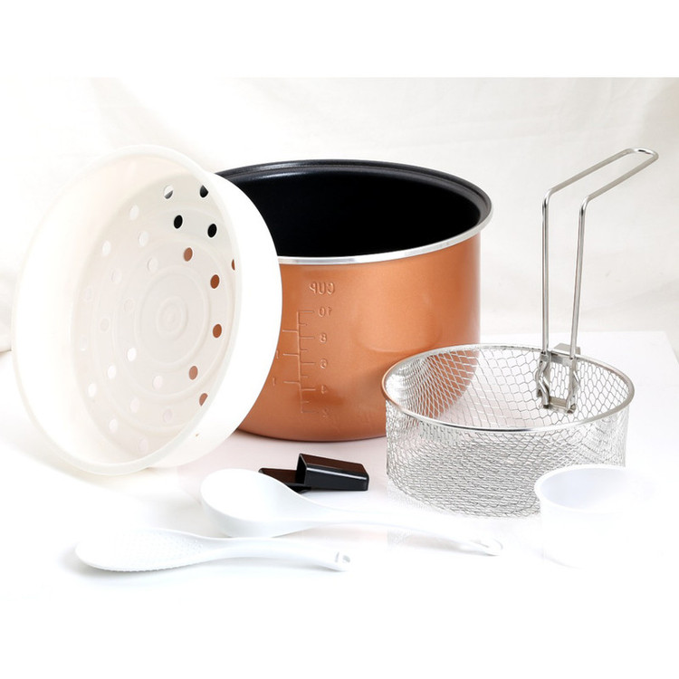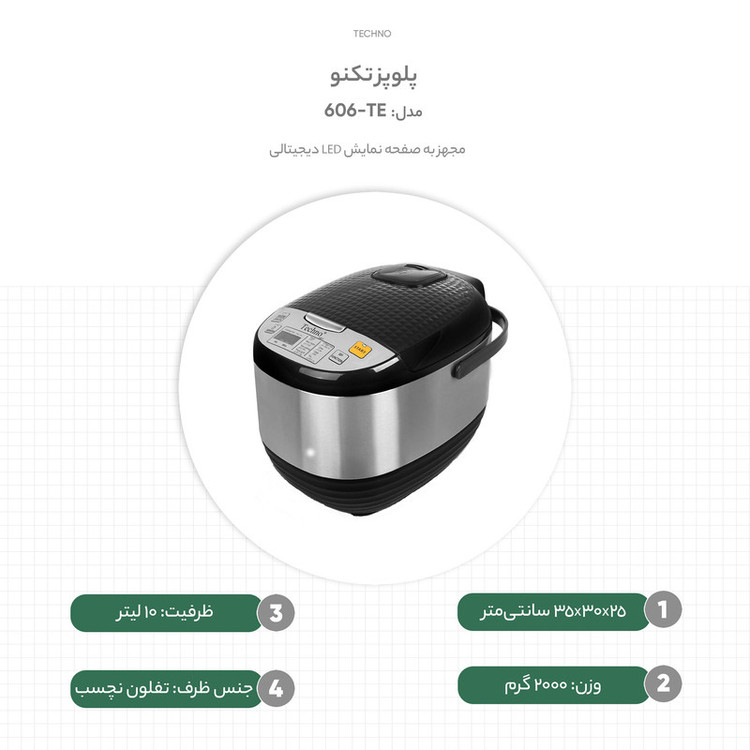 پلوپز 10 نفره تکنو مدل Te-606، از دیگر لوازم پیشرفته با فناوریهای مدرن است که با بهره گیری از توان 700 وات و طراحی بسیار زیبا به بازار عرضه گردیده. بدنه این محصول از استیل ضد زنگ ساخته شده که علاوه بر مقاوم بودن و طول عمر بالای دستگاه، زیبایی فوق العادهای به آشپزخانهها میبخشد. این پلوپز تکنو به دلیل بهره گیری از عملکردهای مختلف، کار پخت و پز را سهل میسازد و امکان پخت برنج، خورش، کیک و دیگر غذاهای متنوع را میسر میسازد. کاربری پلوپز چند منظوره Techno Te 606 بسیار آسان بوده و برای شروع کار کافیست، مواد را داخل دیگ ریخت و از طریق پنل لمسی و فشردن گزینه موردنظر، فرایند پخت آغاز میگردد. تکنو برای جلب رضایت هر چه بیشتر مشتریان، قابلمه این پلوپز دیجیتالی را به صورت دو لایه تفلون با ضخامت 2 میلیمتر ارائه کرده تا با اطمینان خاطر بتوان کیک یا ته دیگهای خوش رنگ و طلایی را آماده نمود. ظرفیتی که تکنو برای 606 در نظر گرفته شده، 1.8 لیتر است که این میزان برای خانوادههایی با جمعیت 8 تا 10 نفر مناسب است. تایمر قابل تنظیم 24 ساعت و قابلیت گرمنگه دارندگی از دیگر ویژگیهای قابل توجه این پلوپز زیبا و کاربردی است و برای علاقمندان به آشپزی که به دنبال راه آسان برای پخت و پز هستند، انتخاب ایده آلی است.