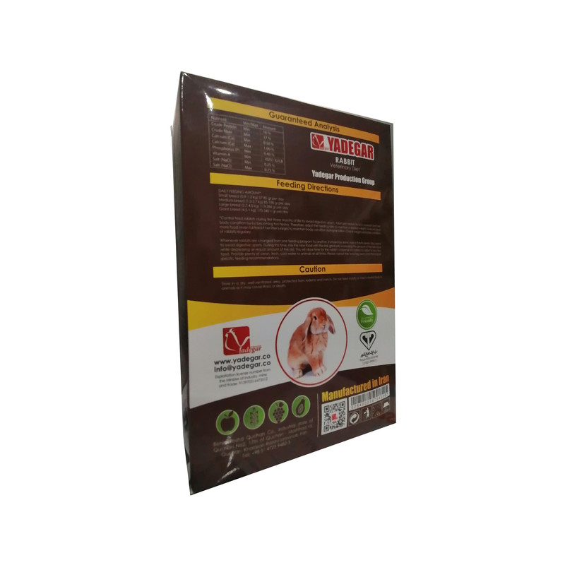خوراک کامل خرگوش گروه تولیدی یادگار، حاوی کلیه ریزمغذی های مورد نیاز جهت رشد و نگهداری از خرگوش است. این خوراک دارای توازن دقیقی از مواد مغذی و ریز مغذی های مورد نیاز حیوان بوده و رشد و پوشش بدن را در بهترین وضعیت ممکن حفظ می کند. از آنجایی که این خوراک بصورتی طراحی شده است که کلیه نیاز های خرگوش را رفع می نماید، نیاز به مصرف سایر خوراک ها را برطرف نموده و در نتیجه صاحب خرگوش دیگر دغدغه خرید سایر اقلام خوراکی را ندارد. در خوراک خرگوش یادگار، باکتری های پروبیوتیکی لاکتوباسیلوس ها و کوکسیدیواستات موجود است که از جمله نقاط قوت این محصول است. کوکسیدیواستات ترکیبی ضد انگلی می باشد و از بروز بیماری های گوارشی که جوندگان، پرندگان و انسان به آن ها حساس است، جلوگیری می نماید. این خوراک برای تمام گونه های جوندگان و در تمامی سنین قابل استفاده است. فاقد آلودگی سالمونلایی مواد تشکیل دهنده: کنجاله سویا، ذرت، گندم، کنسانتره، روغن، کربنات کلسیم شرایط نگهداری: در دمای ۱۵ تا ۲۵ درجه سانتیگراد، بدور از نورخورشید، رطوبت و دسترسی حشرات و جوندگان